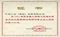 2002年度全國工商聯(lián)上規(guī)模民營會員企業(yè)經(jīng)營情況調(diào)研中營業(yè)收入總額列第1192位