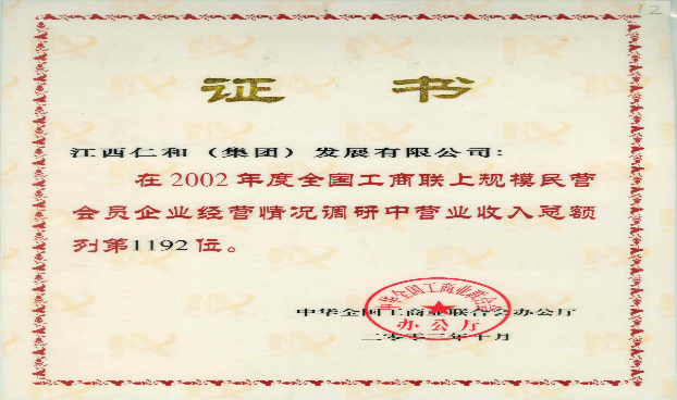 2002年度全國工商聯上規模民營會員企業經營情況調研中營業收入總額列第1192位 發布時間: 2019年12月18日 14:37:40 閱讀量: 9,429 上一篇:2004年國家工商行政管理總局守合同重信用企業