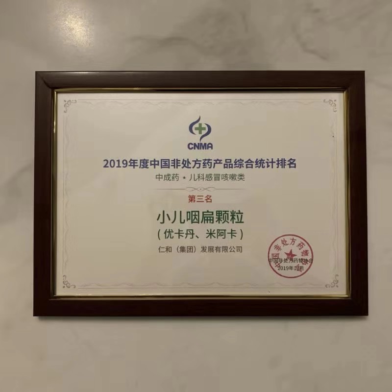 當前位置:網站首頁 關于仁和 企業榮譽 產品榮譽 優卡丹、米阿卡 小兒咽扁顆粒榮獲2019年度中國非處方藥產品綜合統計排名第三名